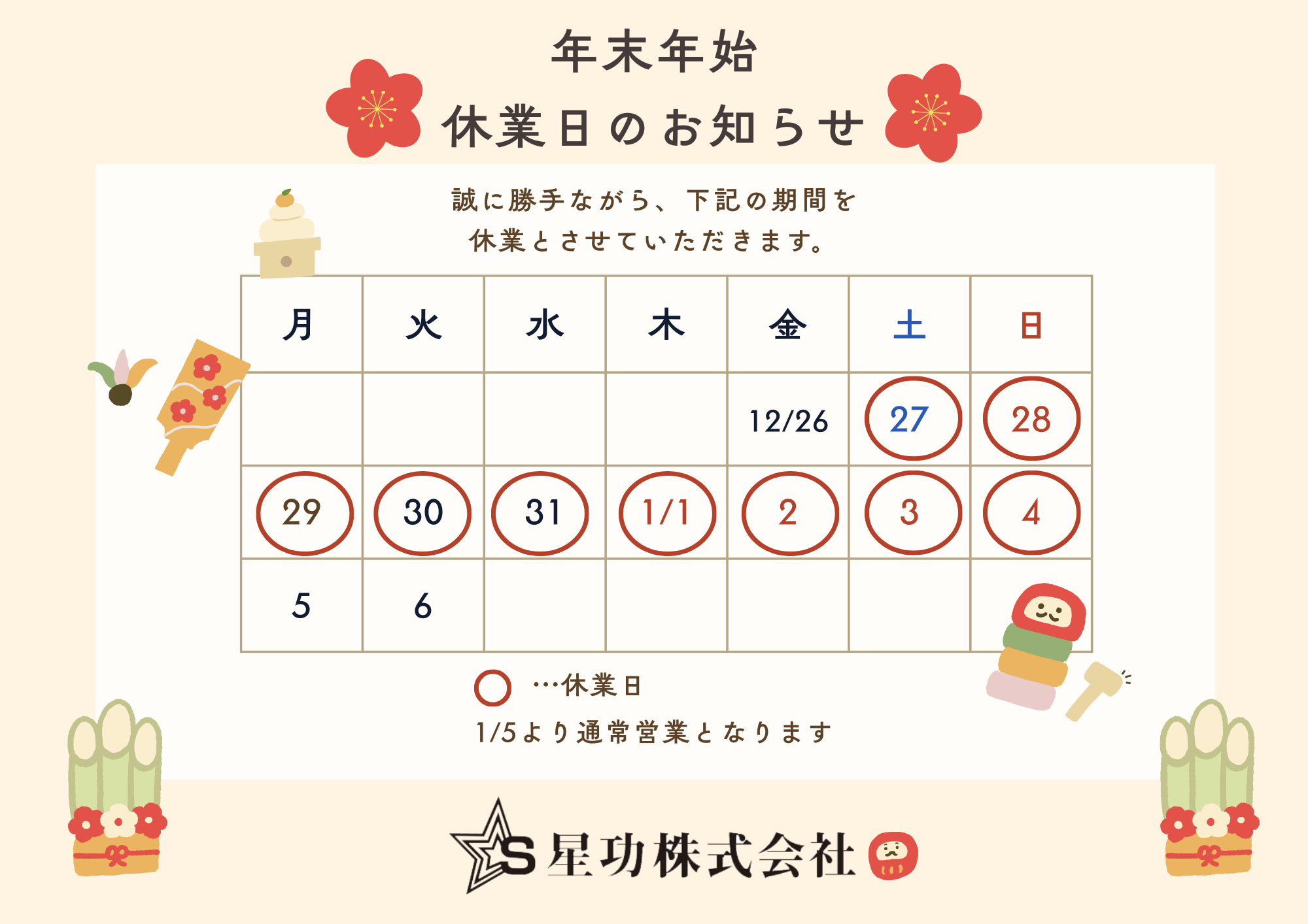 年末年始休業期間:12月27日(土)~1月4日(日)