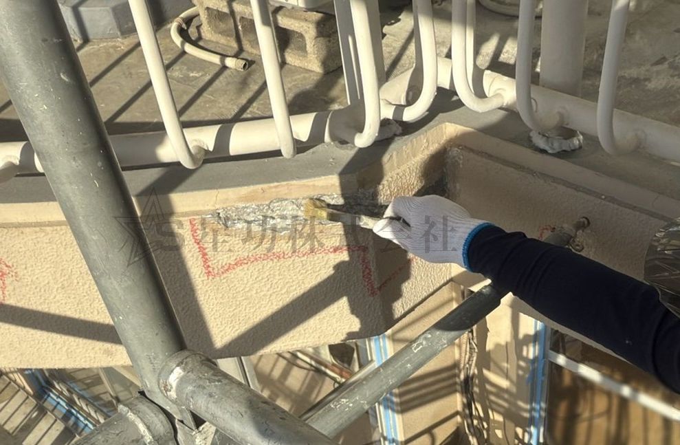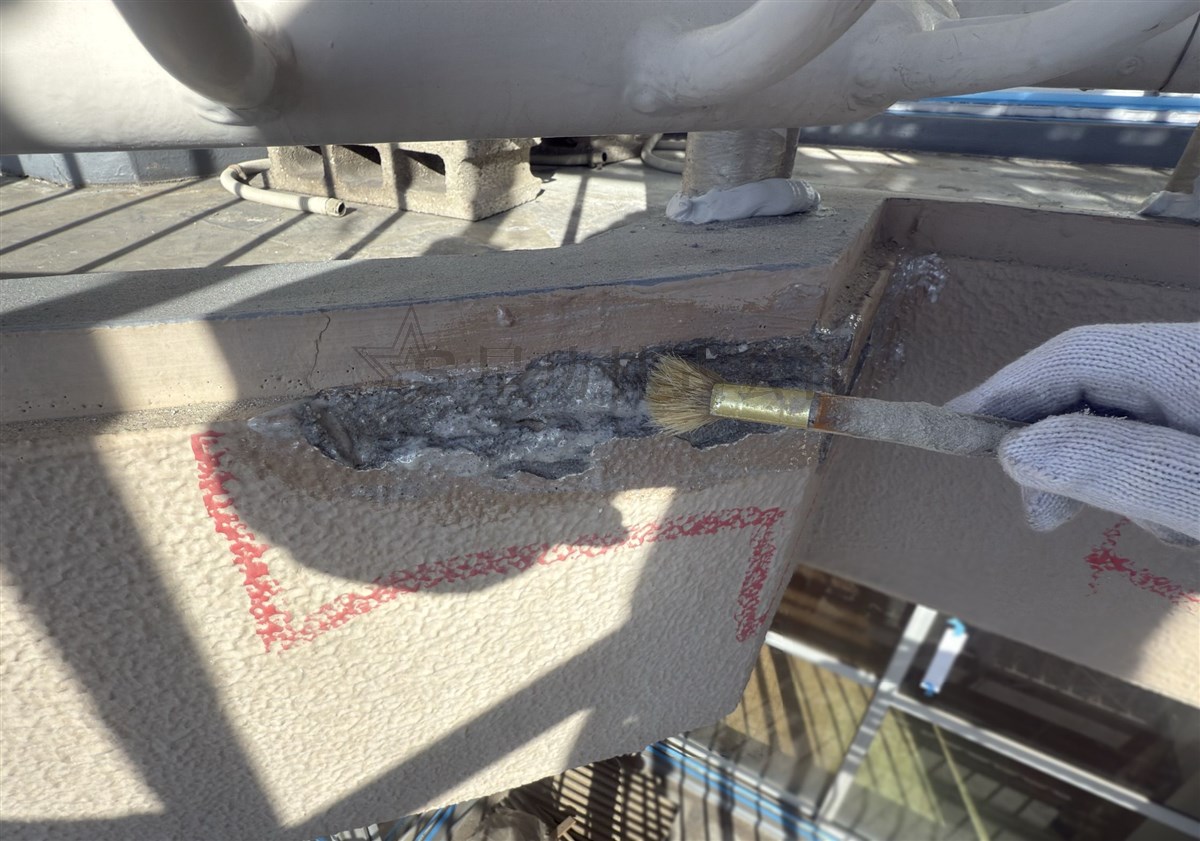 清掃後、剥がれや欠損部分に下塗り材をしっかりと塗布していきます。