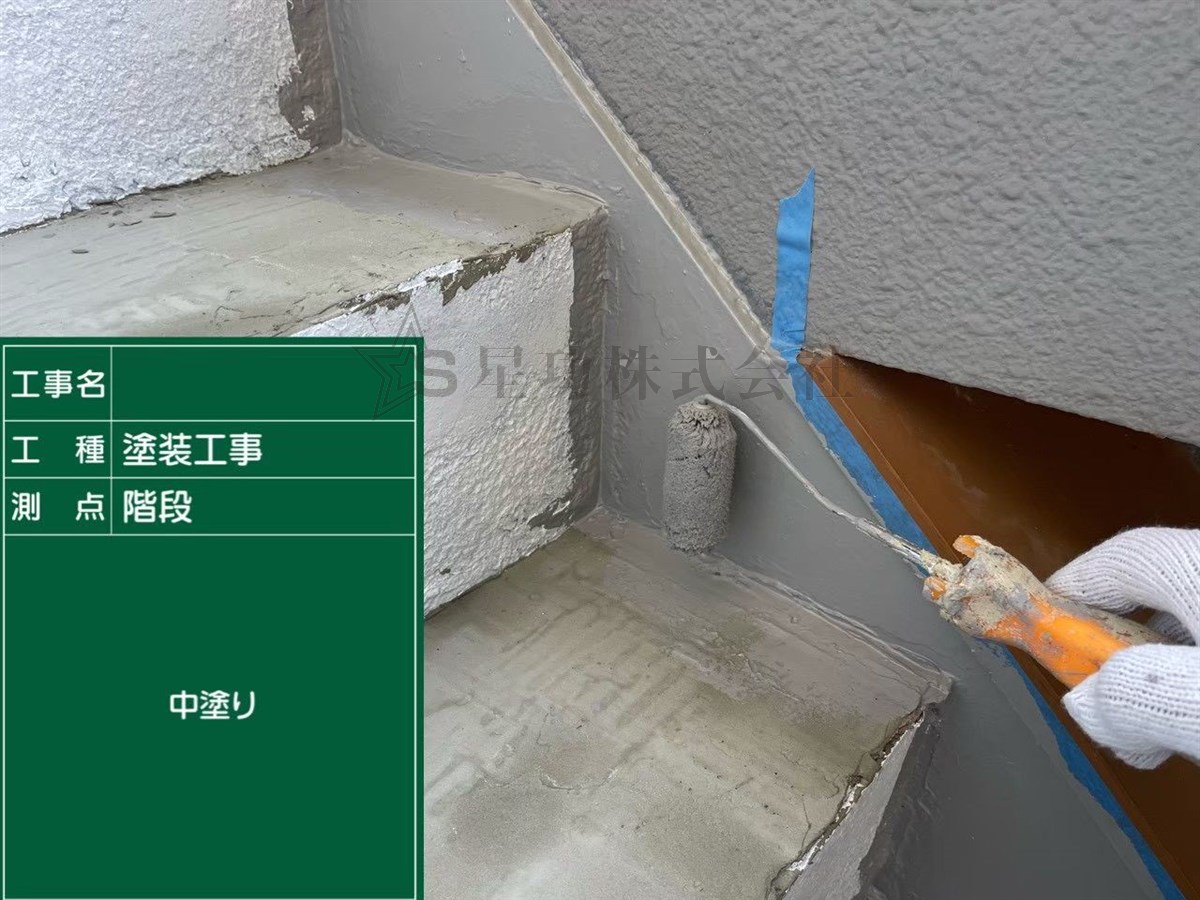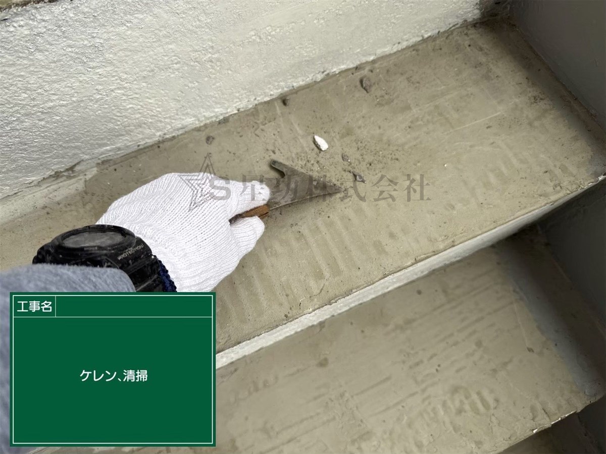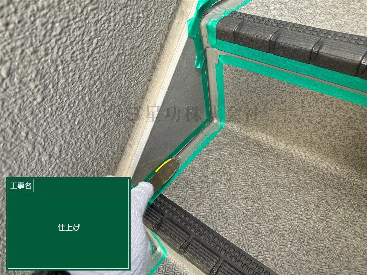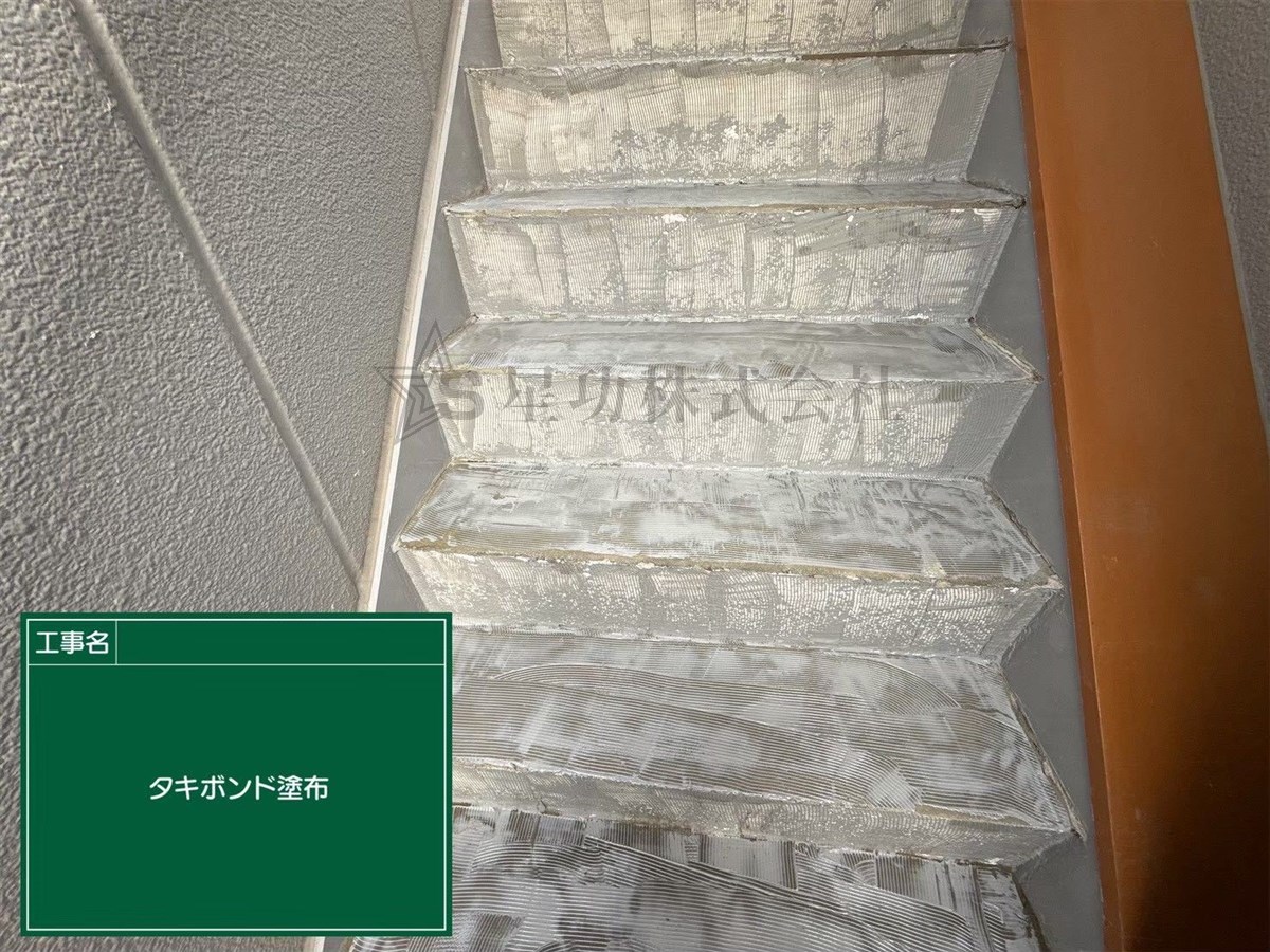 踊場部分・階段の踏み面を平らにするために、モルタル材を塗布していきます。