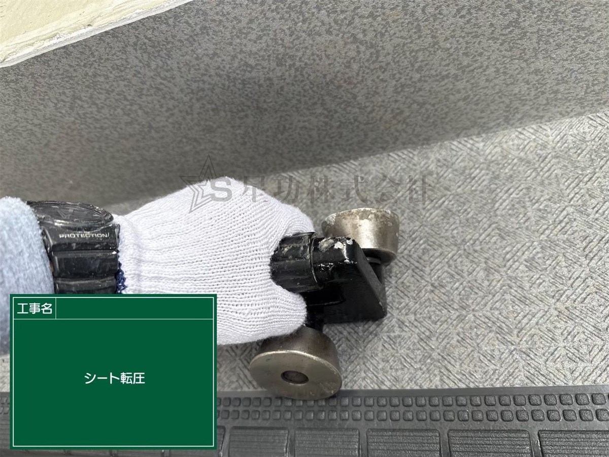 シートをしっかり密着させて浮きやシワを防ぐための大事な押さえ作業です。