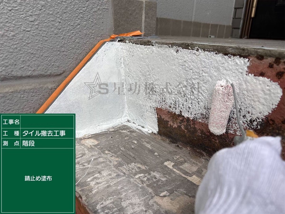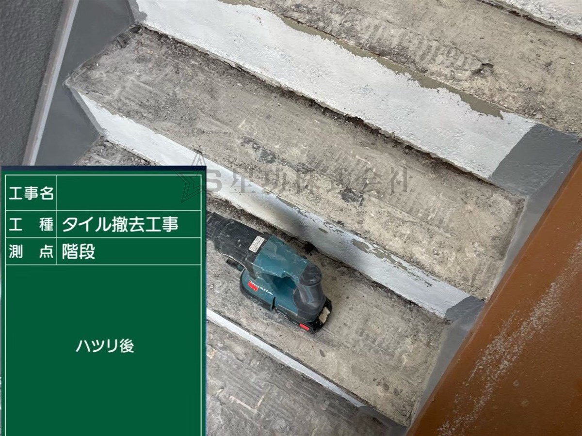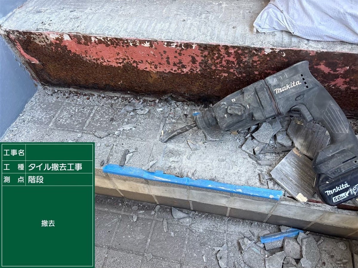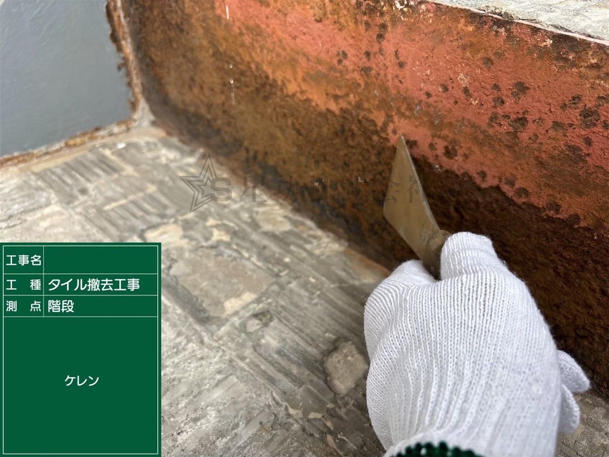 階段の踏板・蹴込板部分のタイルを全て撤去していきます。
