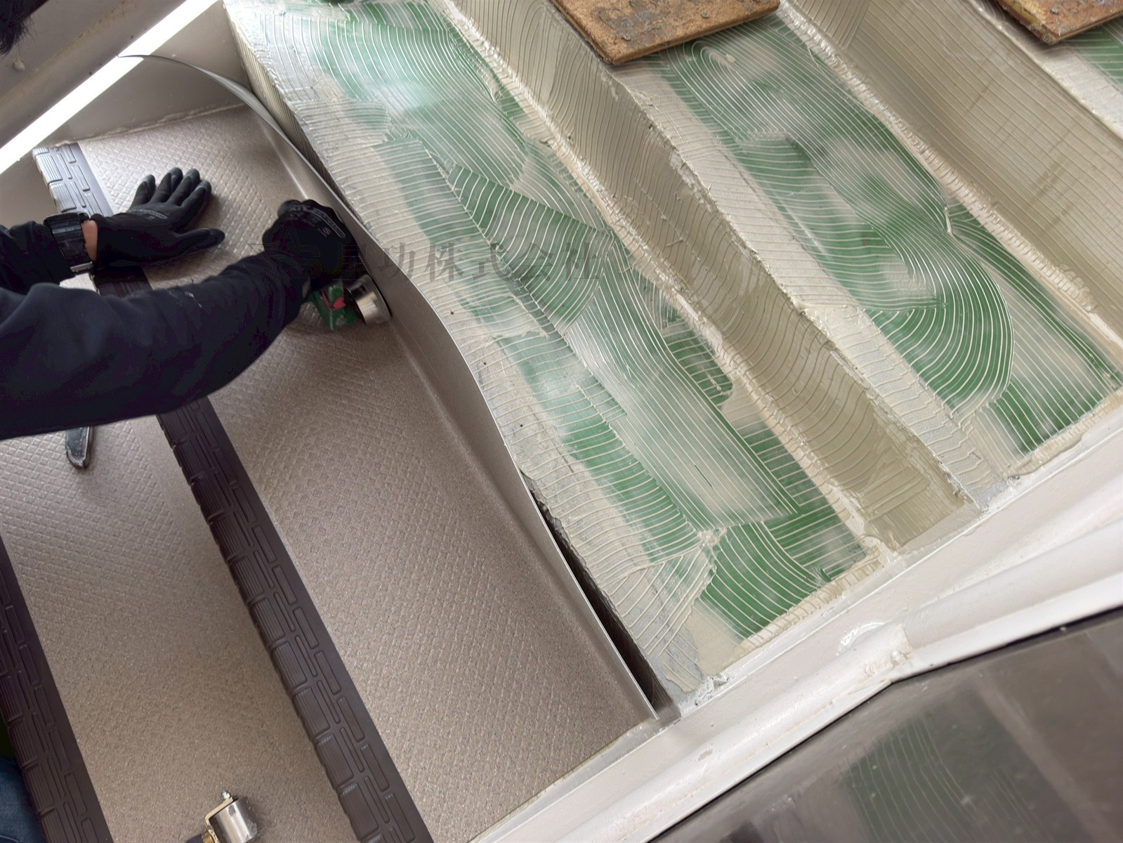 シートの剥がれや浮きに繋がってしまうのでしっかりと清掃し、貼付け用のボンドを塗布していきます。