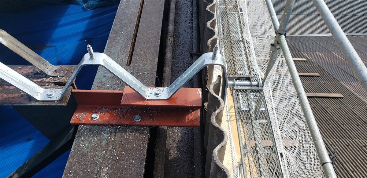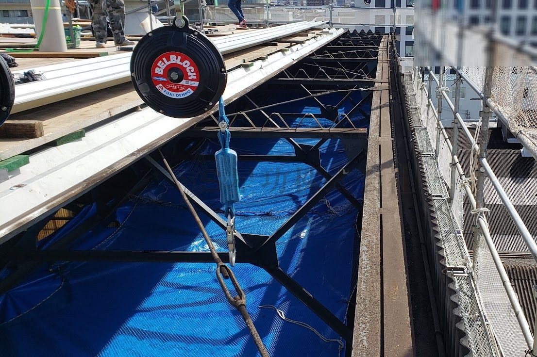 高さ38mの折板屋根の部分取り替え工事は、危険と隣り合わせの作業です。